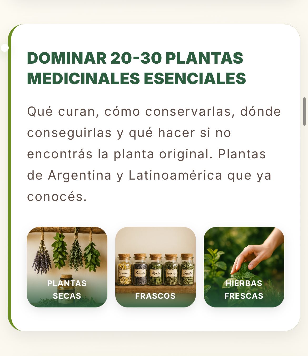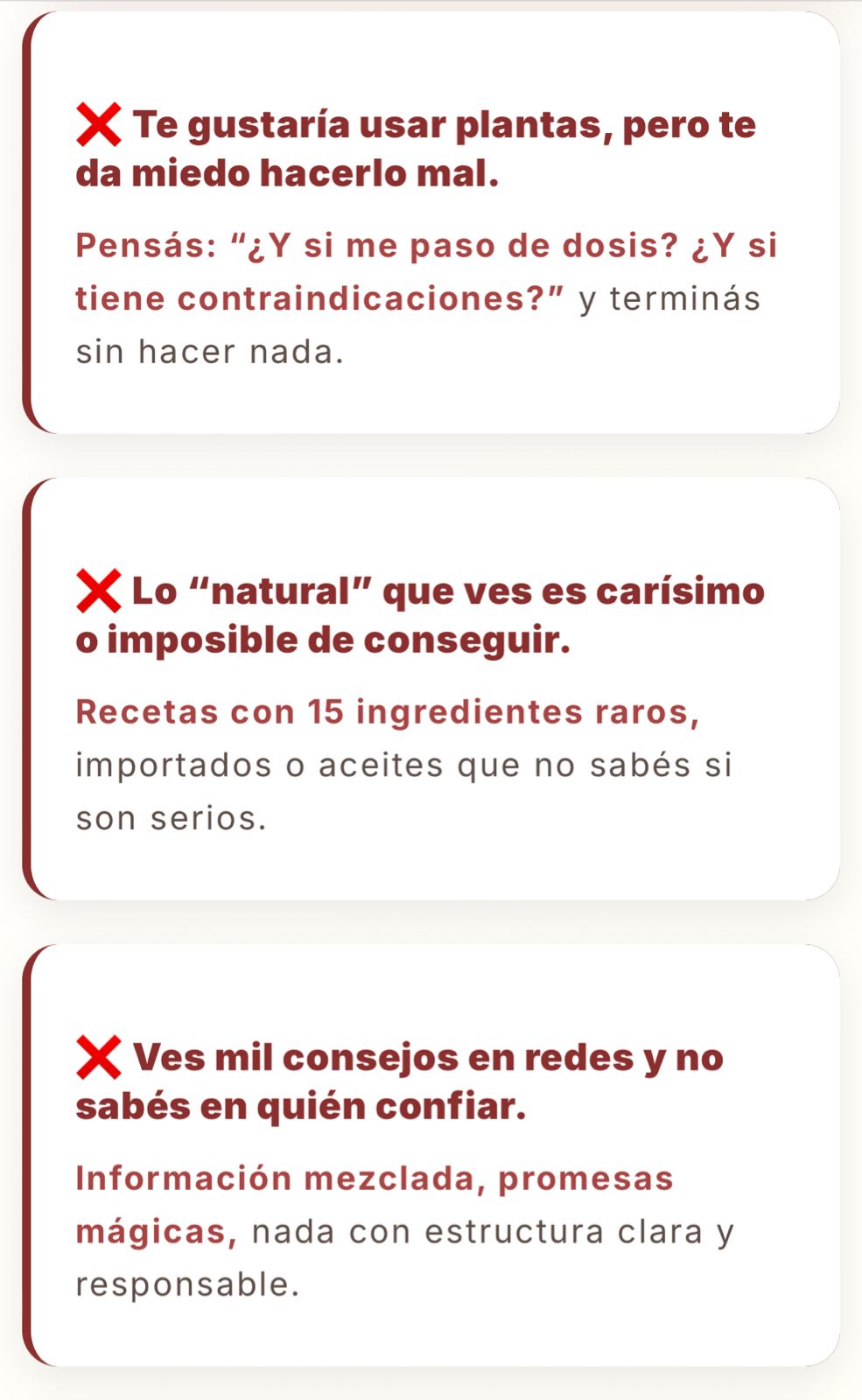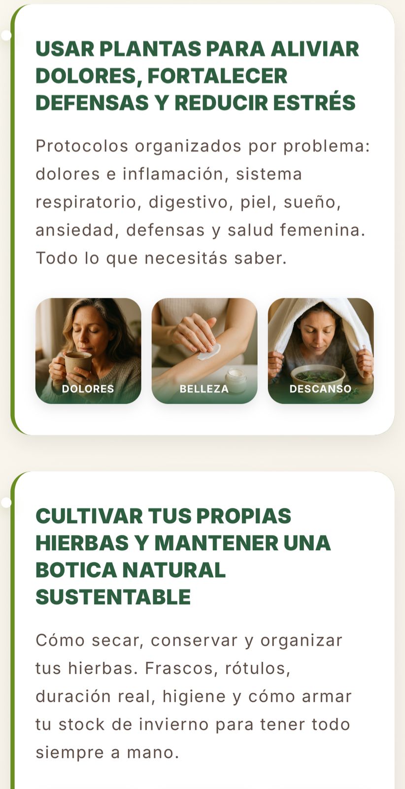 Está ordenado por situación real (dolor de cabeza → hacé esto), con cantidades exactas, y validado por quien lleva 20+ años usando plantas.